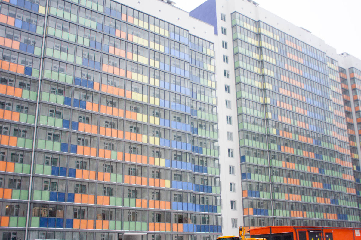 Фасады жилого комплекса раскрашены в яркие летние цвета - зеленые, желтые, голубые, оранжевые. В схожей стилистике оформлены и холлы домов. В парадных установлены скоростные лифты, для удобства семей с детьми предусмотрены отдельные колясочные.
